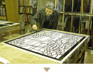 ご承認頂いたステンドグラスデザインを基に、欧米各地から輸入されたアンティークグラス、キャセドラルグラス、オパールセントグラスといった1000種類を越えるガラスの中から最適なガラスが選ばれ、 ガラスがカットされて行きます。 お客様のご承認を頂くため、鉛線による組立て前に透明ガラスにステンドグラスを貼付け当社にてご覧頂くか、 写真をE−mail、郵送等の方法で、お送りさせて頂いています。